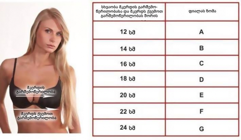 მკერდს ქვემოთ გარშემოწერილობასა და მკერდის გარშემოწერილობას შორის სხვაობა და მისი შესაბამისი ინიციალი იქნება თქვენი ბიუსტჰალტერის ზომა.